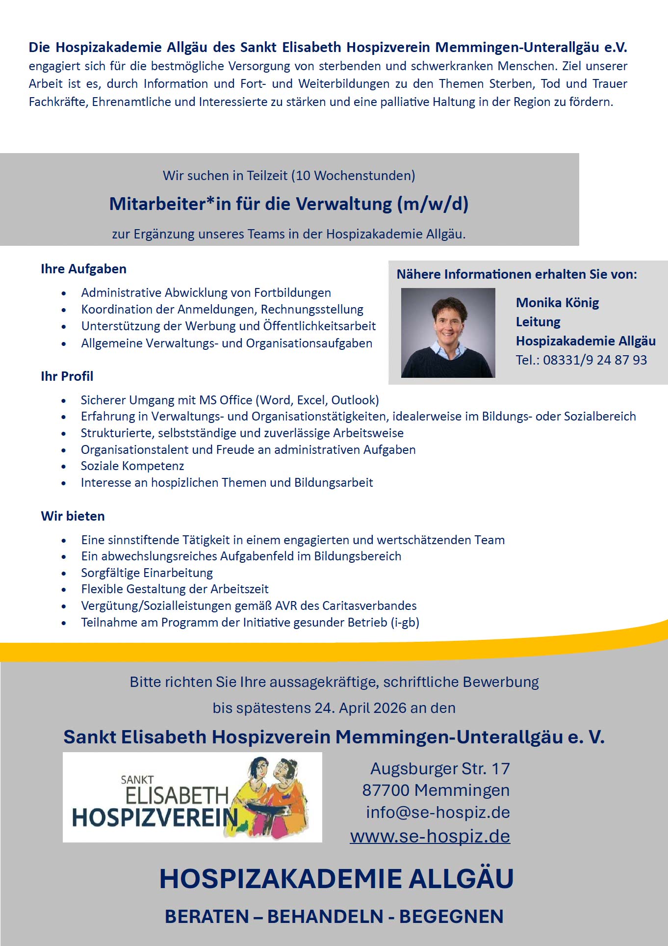 Entdecken Sie jetzt unsere aktuellen Stellenangebote in Memmingen und gestalten Sie mit uns eine wertvolle Begleitung für schwerkranke und sterbende Menschen.